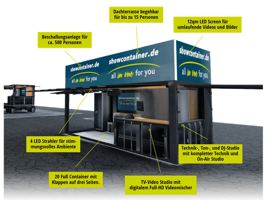 Warum kompliziert, wenn’s auch wunderbar einfach geht?! Und warum standardisiert, wenn’s auch kreativ möglich ist?! Mit unserer Neuheit, dem Showcontainer, bieten wir Ihnen die perfekte Kulisse für Ihre Events. Ob für qualitativ herausragende Radio- und TV-Produktionen, als ausdrucksstarke LED- oder Werbeband oder für sonstige individuelle Aktionen, die modernste Sound-, Video- und Präsentationstechnik erfordern: Unser mobiler Multimedia-Container ist vielseitig einsetzbar und macht Ihr Event zum Vergnügen – und zwar für Sie ebenso wie für Ihre Zuhörer, Zuschauer und Kunden.
