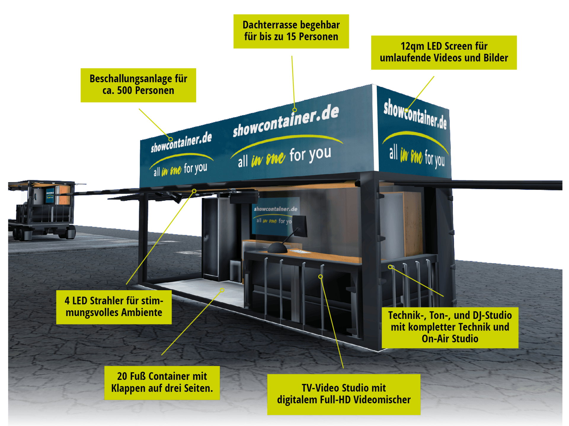 Egal für welchen Anlass sie Aufmerksamkeit und Gehör wünschen. Der Showcontainer bietet Ihnen die passende Plattform. Mit modernster Ton-, Bild- und Video- & LED-Technik ausgestattet, ist der Showcontainer an nahezu jedem Ort aufzustellen. Praktischerweise kommt der Showcontainer auf einem speziellen Trailer, welcher mit Treppen ausgestattet ist, sodass der Showcontainer nicht abgesetzt werden muss, aber kann wenn Sie es wünschen. Das spart Zeit und Geld. Die optionale Bühne kann je nach Anlass in verschiedenen Größen angebaut werden. Die Ausstattung und Möglichkeiten sehen Sie hier auf einen Blick.